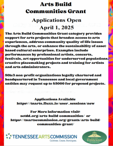 We are excited to announce that the Arts Build Communities Grant is now open for applications for the fiscal year 2026! This grant aims to support innovative arts projects that enhance community engagement and cultural activities. If you’re interested in applying, please ensure that your application is submitted by the deadline of July 1, 2025. For any questions or assistance regarding the application process, don’t hesitate to reach out to us. You can call us at 931-379-2929 or send an email to keubanks@sctdd.org. We look forward to helping you bring your artistic vision to life!